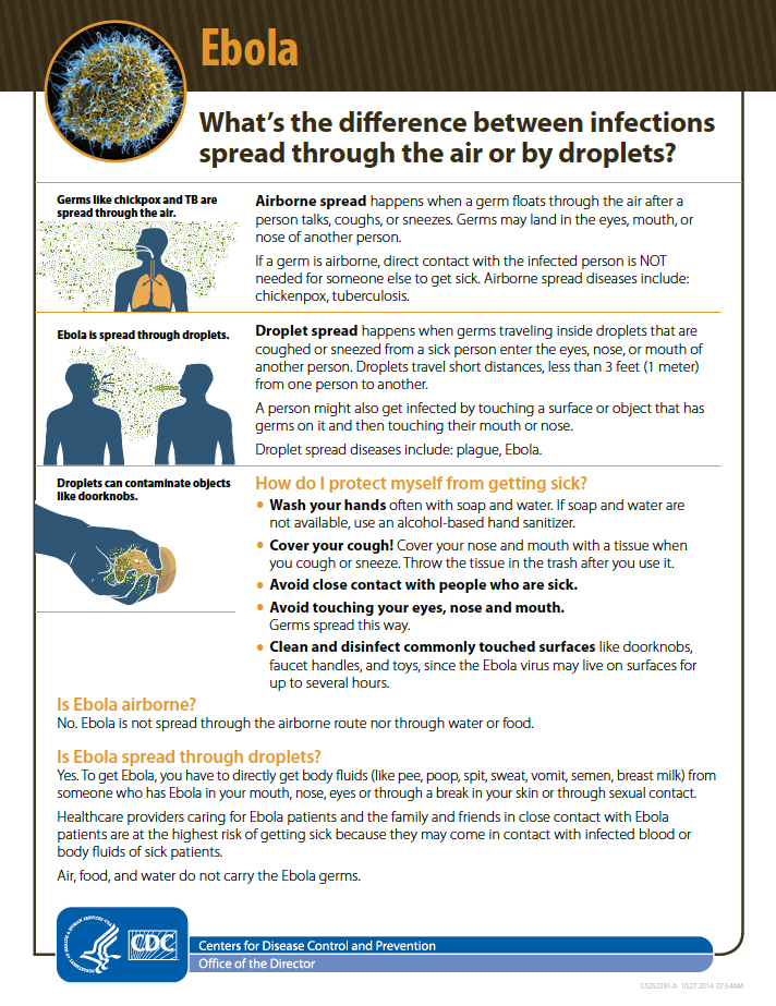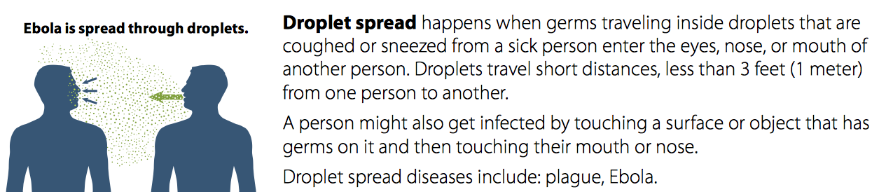 How Ebola Spreads – “(Ebola) droplet spread happens when germs traveling inside droplets that are coughed or sneezed from a sick person enter the eyes, nose, or mouth of another person. Droplets travel short distances, less than 3 feet (1 meter) from one person to another. A person might also get infected by touching a surface or object that has germs on it and then touching their mouth or nose.”