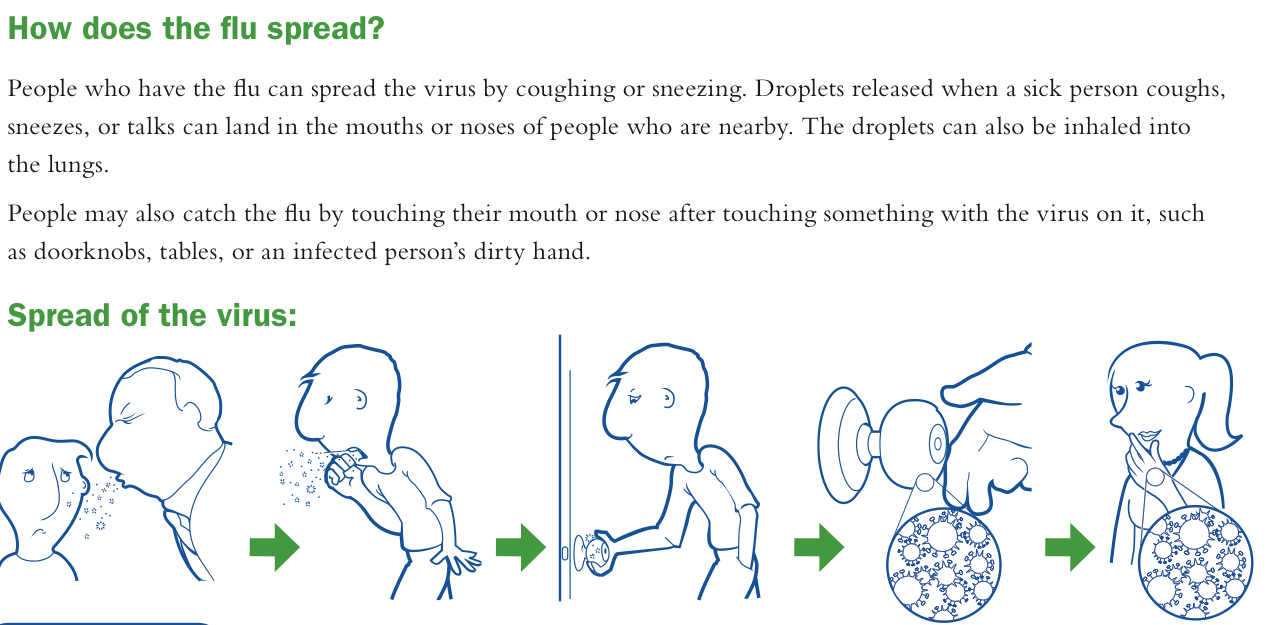 How Flu Spreads – “People with flu can spread it to others up to about 6 feet away. Most experts think that flu viruses are spread mainly by droplets made when people with flu cough, sneeze or talk. These droplets can land in the mouths or noses of people who are nearby or possibly be inhaled into the lungs. Less often, a person might also get flu by touching a surface or object that has flu virus on it and then touching their own mouth or nose”