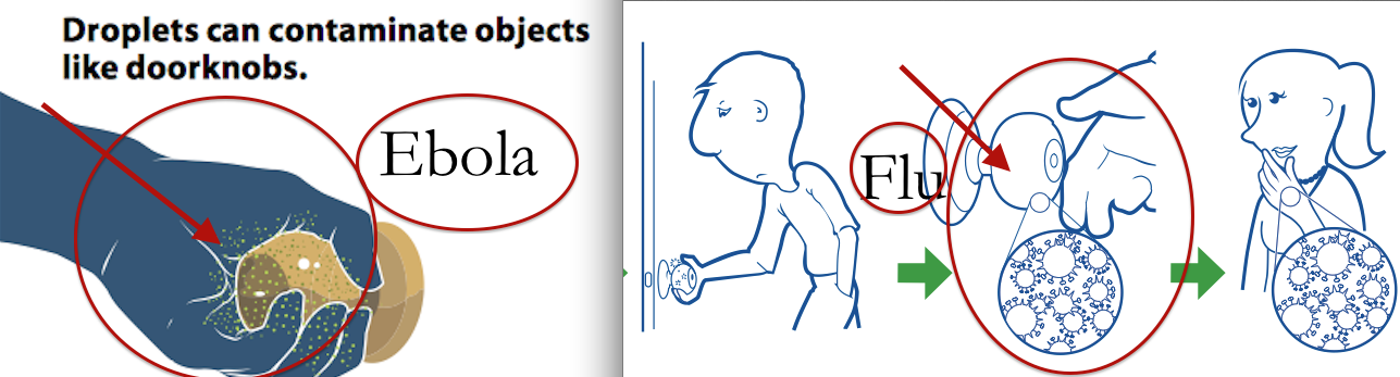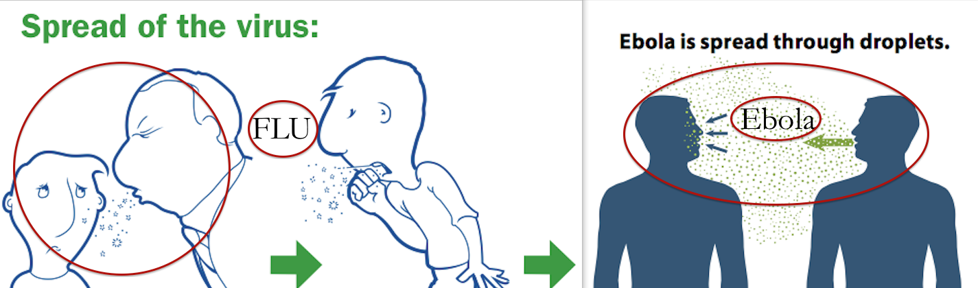 OK, time for some (sick) fun – let’s break down this REALLY seemingly simple flyer and pull it apart piece by piece. First of all, and maybe I’m alone here, but 99% of the people I know, when they are asking the question “is Ebola airborne” aren’t fricken scientists and mean “Yo! CDC, if someone coughs or something, like the flu, can I catch it?”