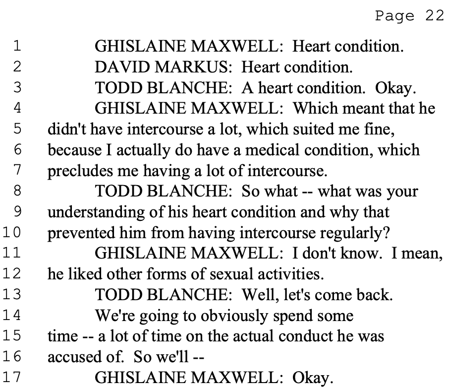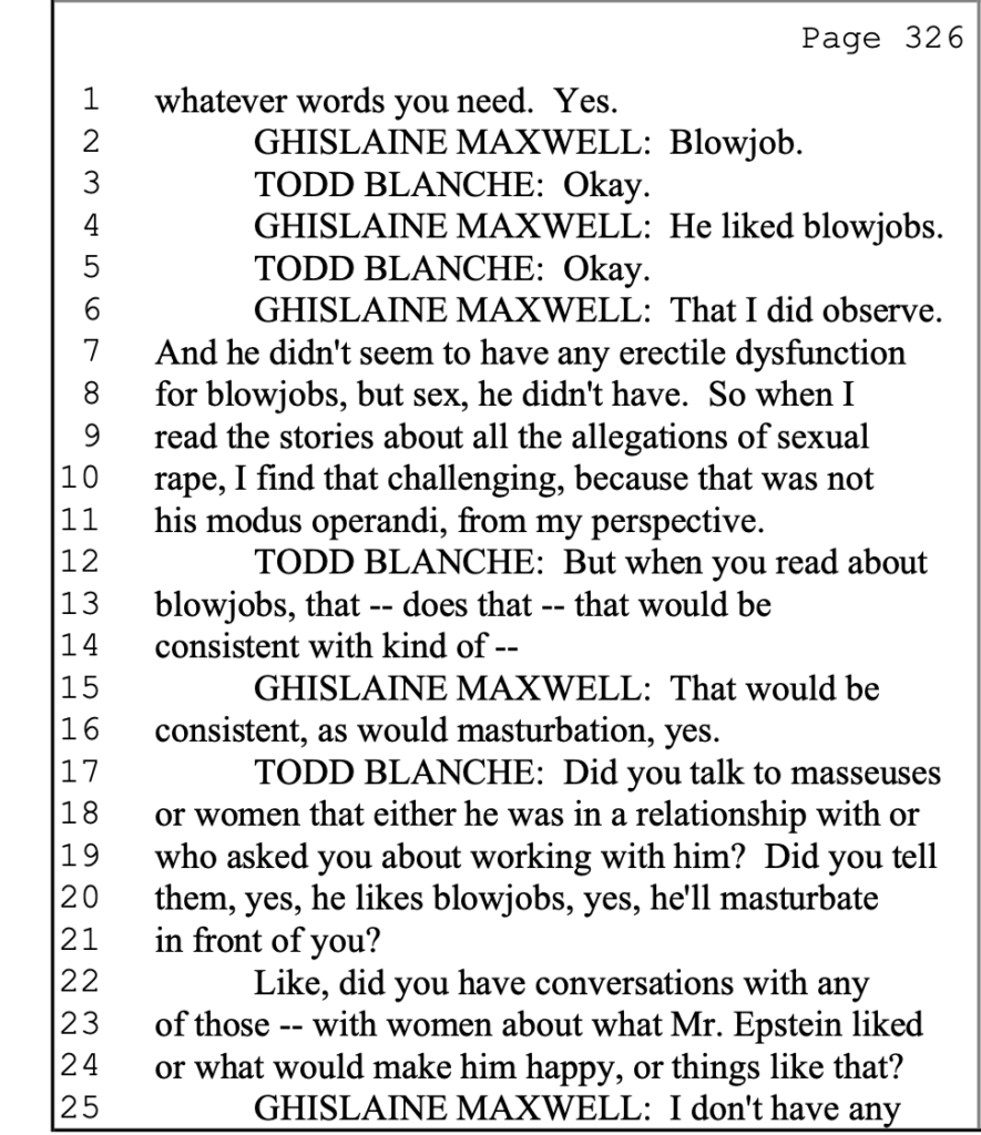 By this logic, she insisted, the allegations of rape made by survivors could not possibly be true because Epstein was simply too ill to have engaged in intercourse.