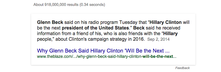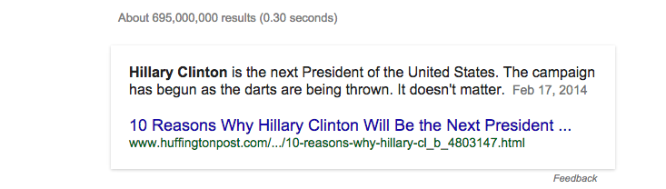 If you try with the slightly altered search phrase “Who will be the next president?” you get the same answer, but a slightly different source: