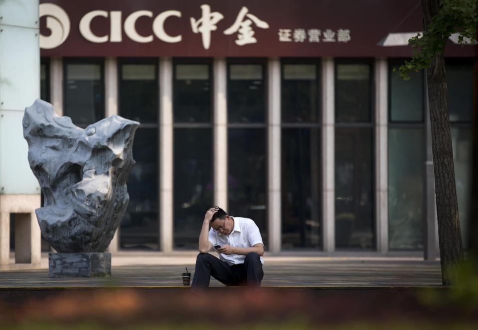 A man rubs his head while browsing his smartphone outside a brokerage house in Beijing Tuesday, July …