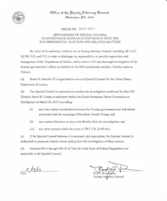 The day after Mueller’s meeting with Trump, Deputy Attorney General Rod Rosenstein appointed Mueller to serve as special counsel for the United States Department of Justice. In the appointment record signed by Rosenstein it reads: