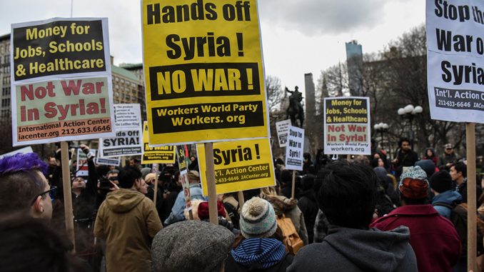 “Get out of Syria, stop interfering, and let the people of Syria decide for themselves,” protester Greg Butterfield said.