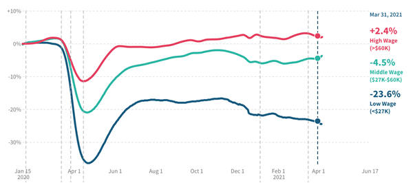 The analysis examined employment levels in January 2020, before lockdown orders and other restrictions on the economy were implemented. It compared them to employment figures from March 31, 2021.