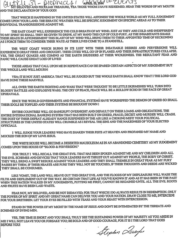 You can read Quayle’s entire prophecy directly below. Videos from David Vose, Alex Jones with Gerald Celente and Paul Begley and others show the amazing similarities between this 21-year-old prophecy and events of today are below prophecy here.
