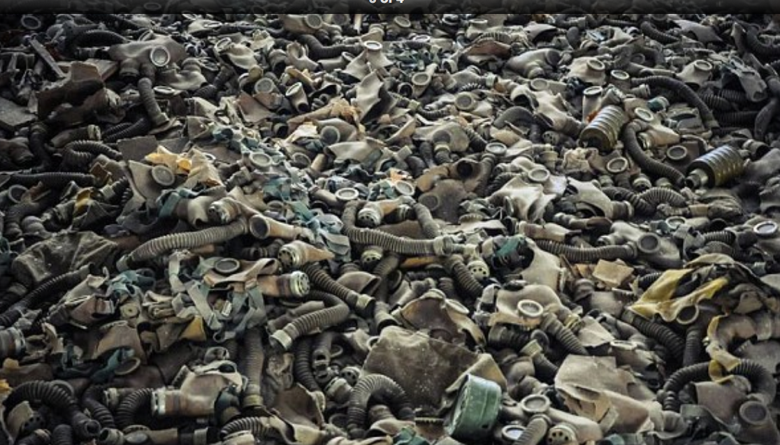 Futile: Hundreds of abandoned gas masks can be seen inside a building in Pripyat. Although tens of thousands of people evacuated the area, a few residents refused to leave