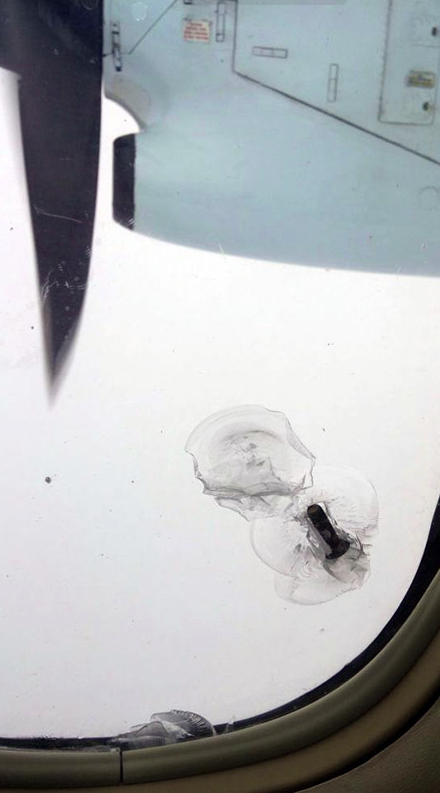 In Skips_LegDay’s own words: “So about halfway through my flight I heard a loud POP, looked out my window at a bolt that flew off the prop and broke through the outer pane.”