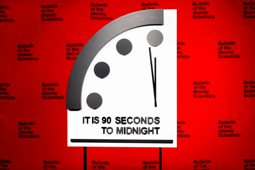 BBC reports: The hands of the clock are moved closer to or further away from midnight based on the scientists’ reading of existential threats at a particular time. Midnight marks the theoretical point of global annihilation.