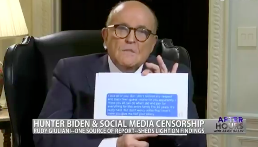 Rudy Giuliani released a private text message retrieved from Hunter Biden’s abandoned laptop hard drive suggesting the distribution scheme in the Biden crime family involves Joe Biden receiving “half” of his son Hunter’s shady earnings.