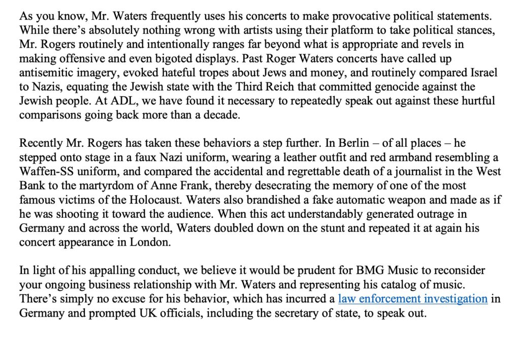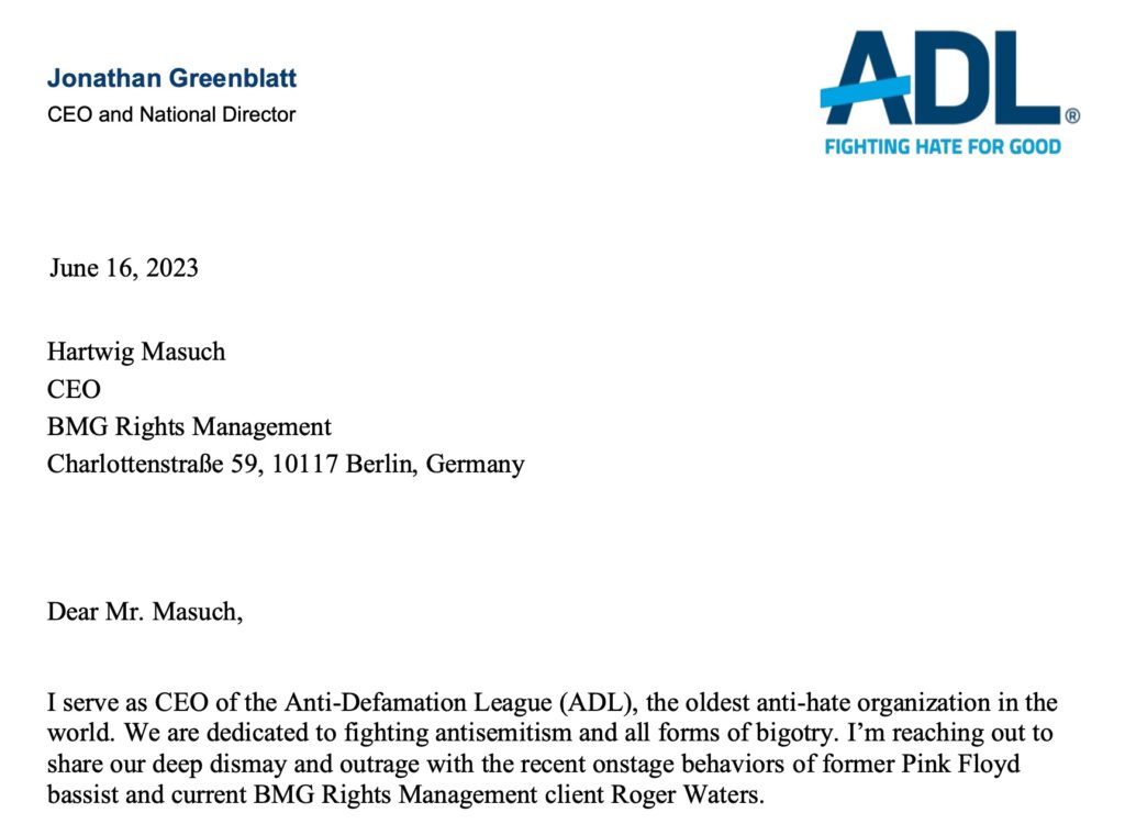 Greenblatt opened his missive with a litany of dubious allegations of antisemitism towards Waters, almost all based on his public advocacy for Palestinian liberation. The ADL director then laid his demands on the table: “we believe it would be prudent for BMG Music to reconsider your ongoing business relationship with Mr. Waters and representing his catalog of music.”