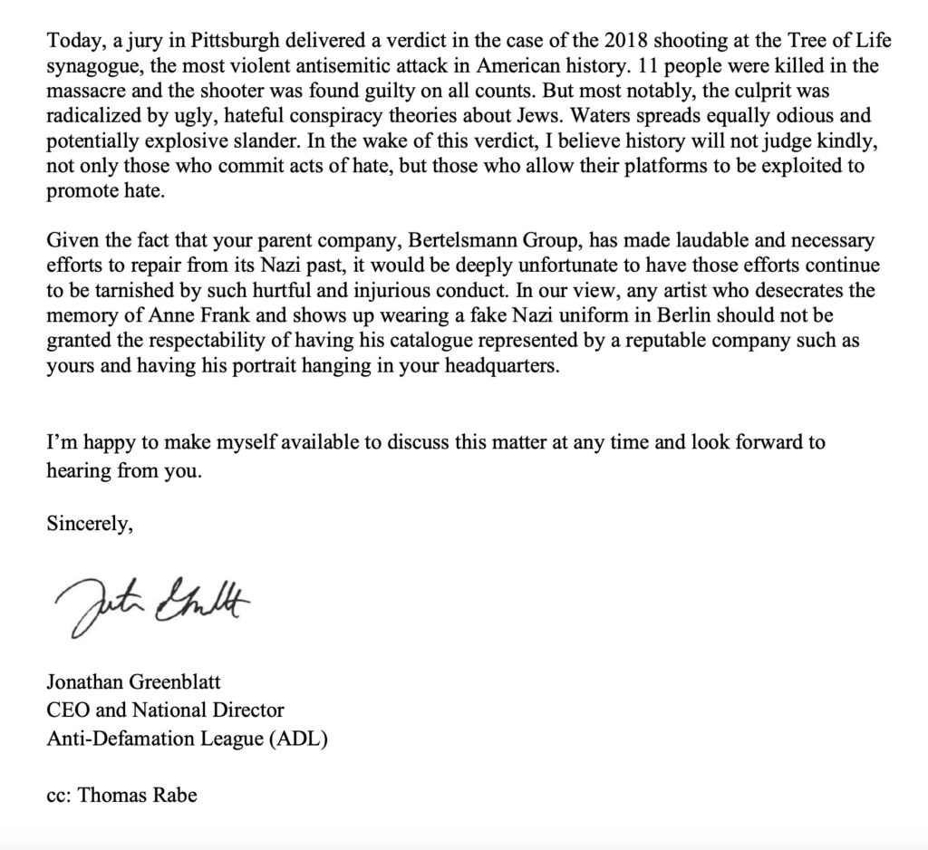 Yet Variety was apparently unaware of the threatening letter which ADL director Jonathan Greenblatt fired off on June 19, 2023 to Hartwig Masuch, then the CEO of BMG, and Thomas Rabe, the chairman of the board of BMG’s parent company, Bertelsmann.