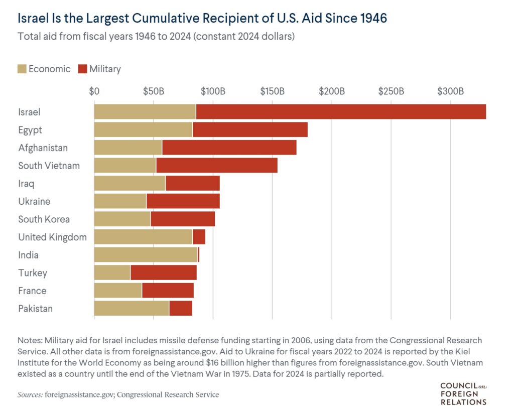 The US has given Israel some $330 billion in military and economic aid from 1946 to 2024, and the numbers keep going up. Of course, that doesn’t count the $2 trillion the US spent on the war in Iraq at Israel’s behest.