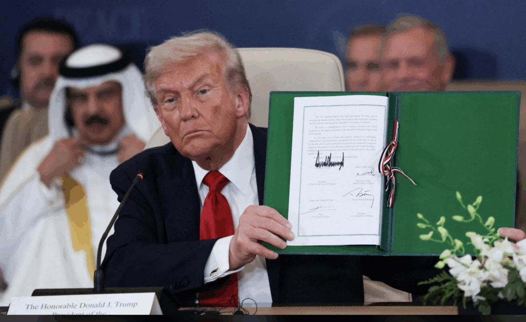 During the signing event, U.S. President Donald Trump joined Egyptian President Abdel Fattah el-Sisi, Turkish President Erdoğan, and Qatari Emir Tamim bin Hamad Al Thani, along with assorted leaders from Europe and the region.