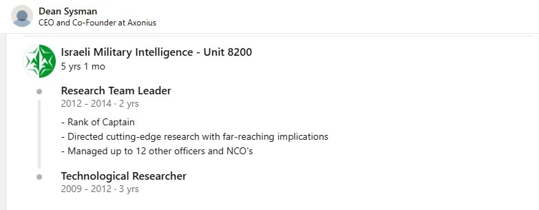 Axonius was founded and is currently run by Israelis Dean Sysman, Ofri Shur and Avidor Bartov, who met in the 2010s while working on the same team within Israel’s Unit 8200 spy agency. On his LinkedIn profile, Sysman offers few details of their work for the IDF, describing it simply as having ‘far-reaching implications.’