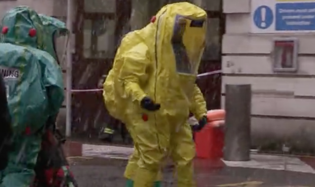 RT reports: Paramedics in biohazard suits treated 50 ‘casualties’ played by Royal Military Police personnel, who were put through decontamination showers.
