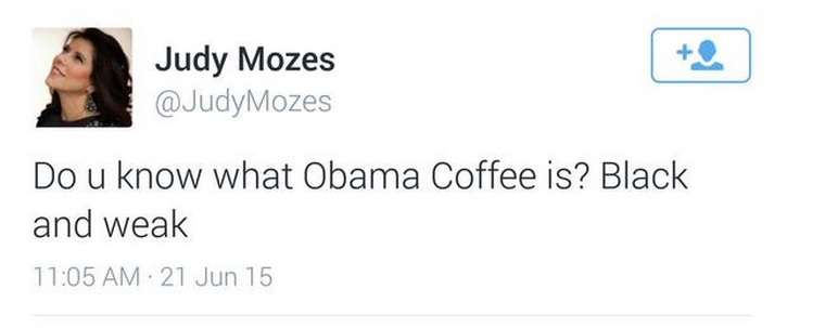 Judy Shalom Nir-Mozes, wife of a senior Israeli minister, sparked outrage after tweeting “Do you know what Obama coffee is? Black and weak” on Sunday.
