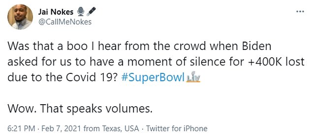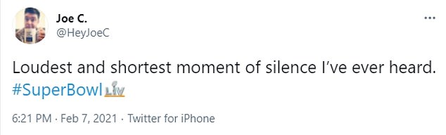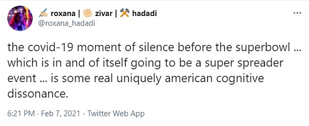 ‘The 20,000+ people at the super bowl not observing the moment of silence for lives lost to COVID somehow… makes sense,’ one person shared.