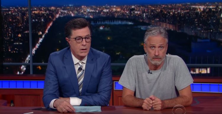 Jon Stewart and Stephen Colbert, at the latter’s Late Show desk, make for a laugh riot. Their political commentary began with their celebration of the resignation of sexual offender and chairman of Fox News, Roger Ailes. But what was funnier was Stewart’s vicious take-down of Donald Trump.