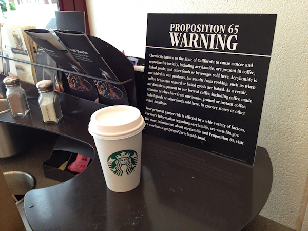 Many coffee companies have already agreed to post warnings about acrylamide. However, many of those warnings were almost invisible to their customers due to placement below serving counters. Starbucks claimed that labelling its cups with cancer warnings would be misleading and alarming to consumers, as the beverage has always been largely considered to be a healthy product.