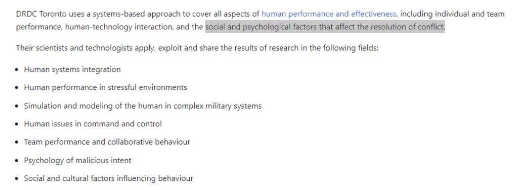 What sort of stuff is researched at DRDC? “Human systems integration.” “Social and psychological factors that affect the resolution of conflict.” “Psychology of malicious intent.” “Social and cultural factors influencing behavior.”