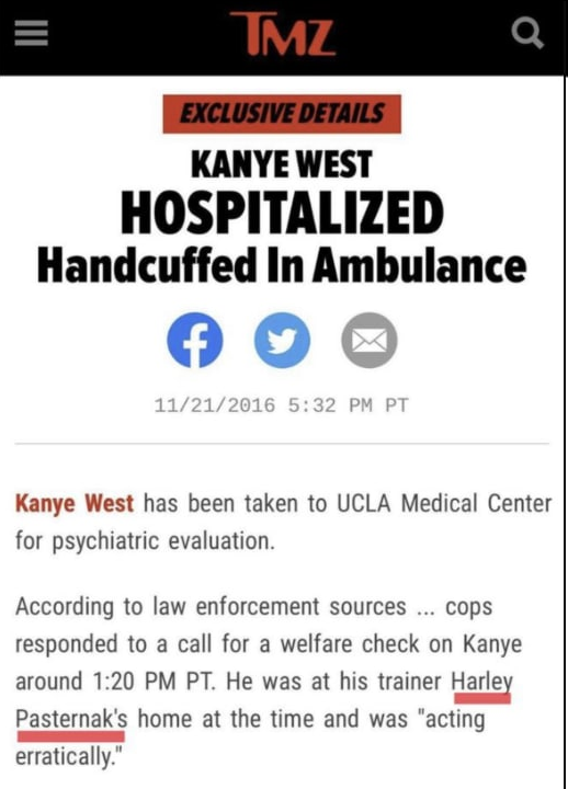 Also worth noting is the fact that Kanye West was hospitalized in late 2016. Where was he at the onset of his alleged breakdown, when he was institutionalized against his will? Harley Pasternak’s home, of course! Note that in the text messages Kanye posted, Harley threatens to have him institutionalized “again.”