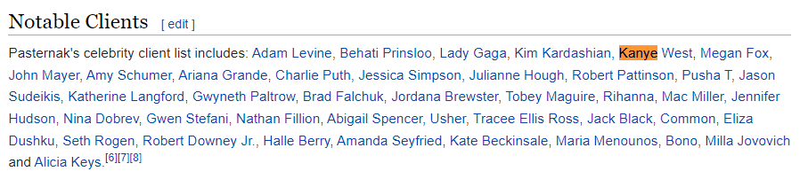 Someone recently removed from Harley Pasternak’s Wikipedia entry two main things. Any reference to Kanye West. And the lengthy list of his celebrity clients. Curious, isn’t it?