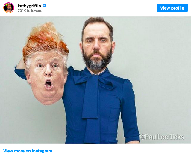Breitbart report: Griffin posted the photo months after she said she has an extreme case of complex post-traumatic stress disorder (PTSD) that arose shortly after her cancelation resulting from her photograph of holding a model of Trump’s bloodied severed head.
