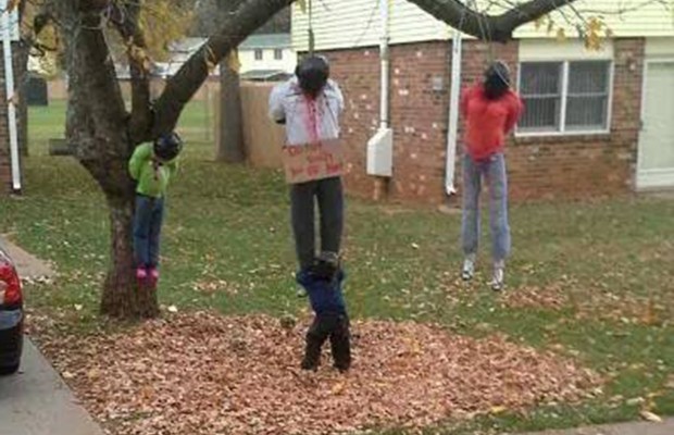 Clarksville.com reports that one of its readers sent in a photo of four figures hanging in the home’s front yard. The child has a knife in its back and one of the figures is holding a sign that is hard to read in the photo.