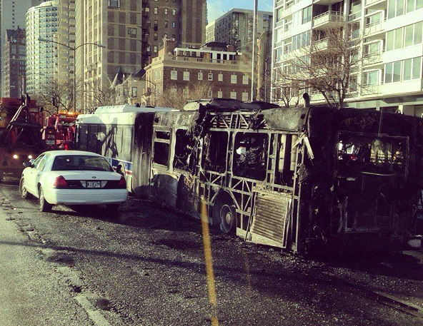 The bus fire started about 5 a.m. in the southbound lanes of Lake Shore Drive between North and Chicago Avenues, according to the Chicago Fire Department.