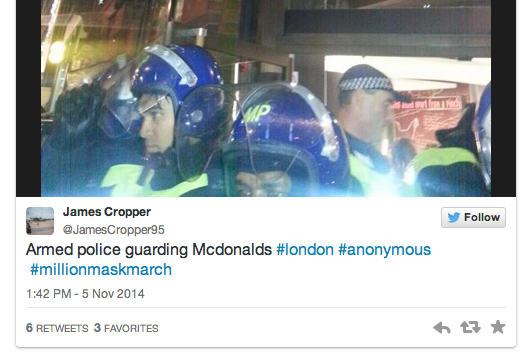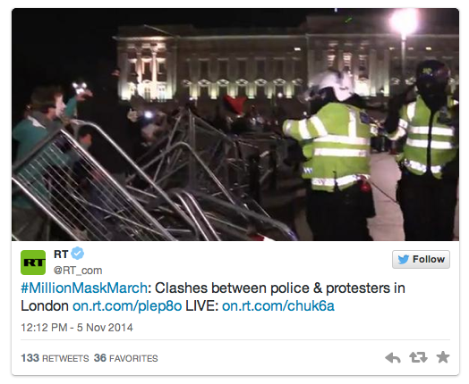 At least five people were arrested amid sporadic clashes between the Million Mask March protesters and police in London. Authorities said that people were apprehended for assaulting police officers, setting off fireworks, obstruction and at least one case of attempted grievous bodily harm.