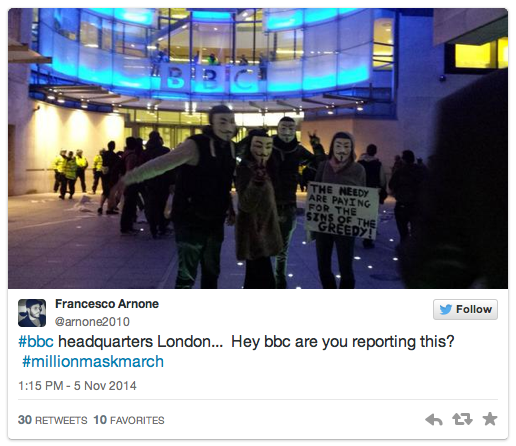 The Million Mask March is sweeping the globe Wednesday as demonstrators protest against austerity, mass surveillance and oppression in more than 400 cities around the world. The “Million Mask March” called for by Anonymous is famed for featuring demonstrators wearing Guy Fawkes masks, adopted by the collective from the V for Vendetta novel.