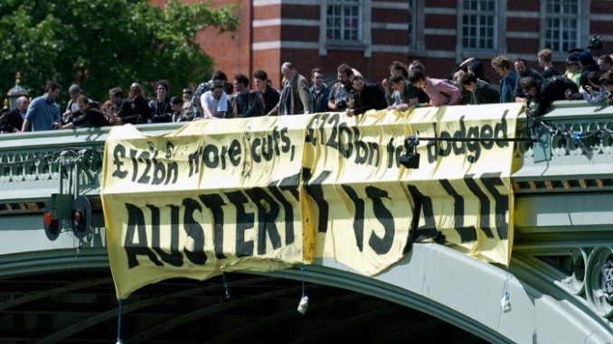 As dozens of police watched, protesters first painted, then hung a 20 metre banner over the side of the bridge facing parliament. “12bn more cuts. £120bn tax dodged,” it said. “Austerity is a lie.”