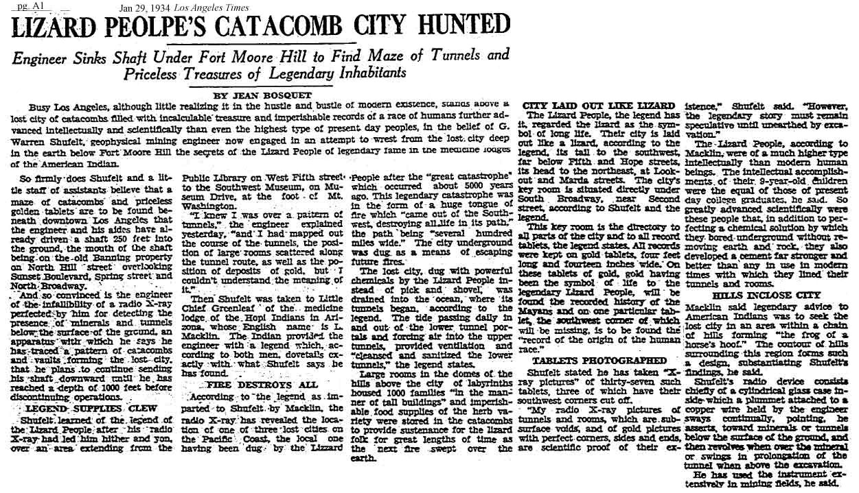 At least that’s what mining engineer W. Warren Shufelt claimed in the January 29, 1934 edition of the Los Angeles Times. According to reporter Jean Bosquet, Shufelt was ready to dig up downtown L.A. in search of this ancient subterranean civilization.