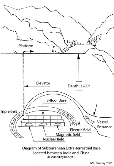 The spacecrafts accessed the base by way of a snaking tunnel with a funnelshaped entrance situated lower in the valley. It opened onto an immense hangar where the spacecrafts and personnel were located. Robert saw vessels entering from 90 feet away.