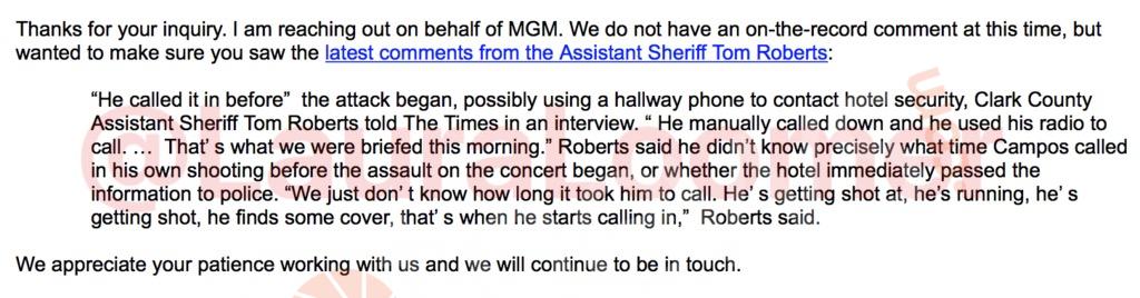 A spokesperson for MGM Resorts International, which runs the Mandalay Bay Resort and Casino, declined to comment on the report that Campos is no longer in the system, instead pointing to recent comments from Assistant Sheriff Tom Roberts regarding Campos calling in the shooting that night: