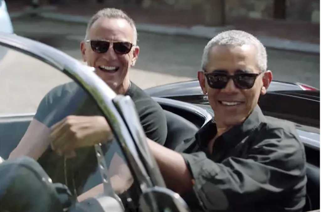 Former US President Barack Obama behind the wheel with his friend and podcast co-host Bruce Springsteen