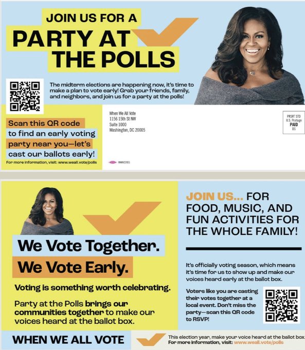 Inviting potential voters to “join us for a party at the polls,” the registration letters feature the visage of Michelle Obama and messages urging Democrat voters to “vote together” and “vote early.”