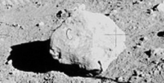 One of the most famous photos from the moon landings shows a rock in the foreground, with what appears to be the letter “C” engraved into it. The letter appears to be almost perfectly symmetrical, meaning it is unlikely to be a natural occurrence. It has been suggested that the rock is simply a prop, with the “C” used as a marker by an alleged film crew. A set designer could have turned the rock the wrong way, accidentally exposing the marking to the camera.NASA has given conflicting excuses for the letter, on the one hand blaming a photographic developer for adding the letter as a practical joke, while on the other hand saying that it may simply have been a stray hair which got tangled up somewhere in the developing process.