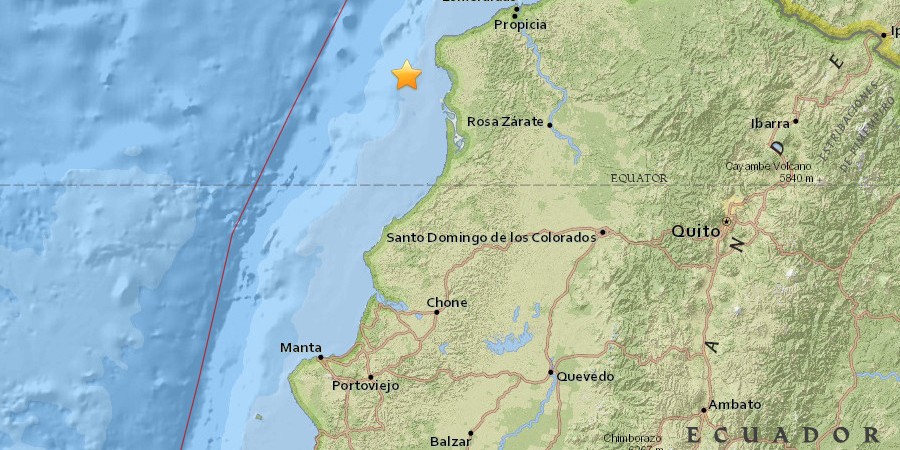 The latest big tremor, which followed several hundred aftershocks from Saturdays quake, hit 25 km (15 miles) off the island of Muisne on the northwest coast at a depth of 15 km (9 miles), the U.S. Geological Survey said.