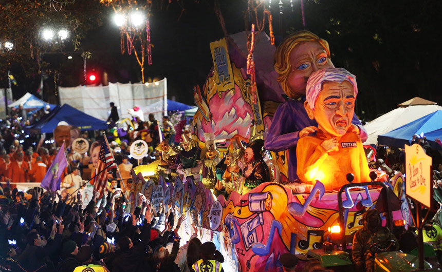 The American Mirror reports: The float shows “Epstein” in an orange jumpsuit with a blond-haired woman resembling Clinton standing behind him holding something around his neck in the New Orleans parade.