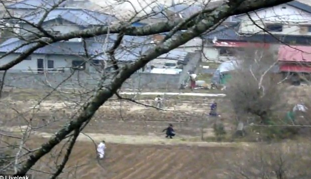 Residents from the town, believed to be called Minami-sanriku, are seen running up the side of a hill to safety as the water behind them closes in on them.