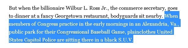 “When members of Congress practice in the early mornings in an Alexandrea, Va., public park for their Congressional Baseball Game, plainclothes United States Capital Police are sitting there in a blac S.U.V.”
