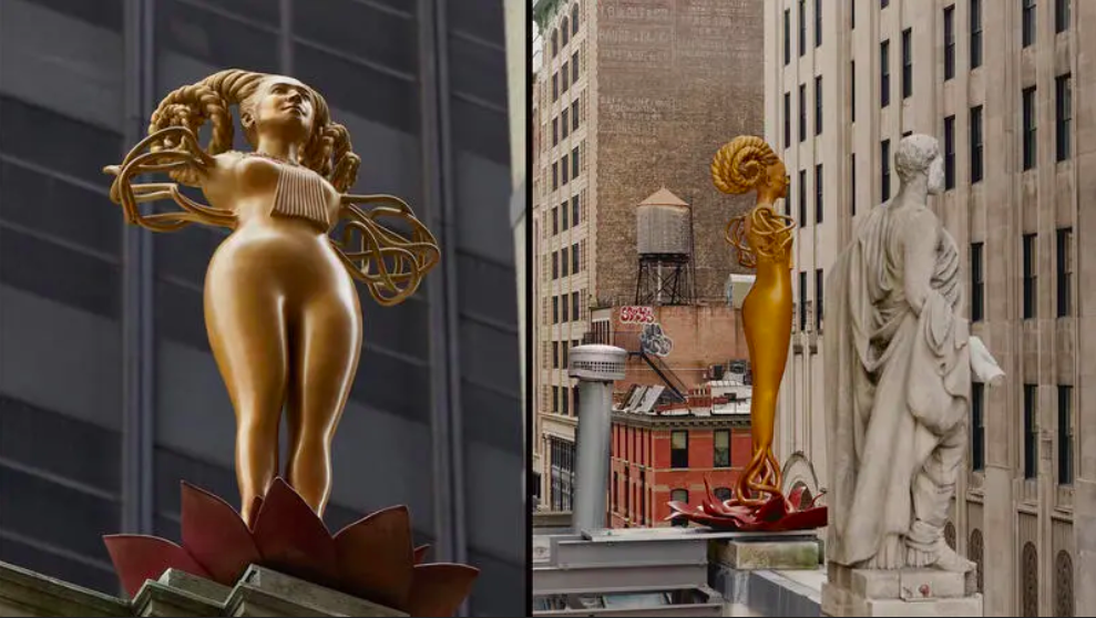 The artist, Shahzia Sikander, created the statue “NOW,” which appears as the body of a woman emerging from a lotus, which is often associated with the pagan gods Nefertem as well as the Hindu gods Vishnu and Brahma. The horned, demonic figure has also been compared to the statue of Shiva, the Hindu goddess of destruction, outside the CERN facility in Geneva, Switzerland.