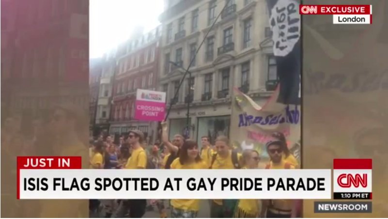 In this hilarious clip, CNN anchor Lucy Pawle fails to realise that what the news channel have incorrectly labelled as an “ISIS flag” is actually a flag depicting sex toys, held by somebody during a gay pride parade.