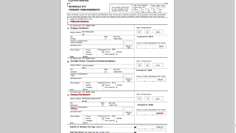 Hillary for America is again paying for 3 months of “research”, but now, the price tag has dramatically decreased to $6,346.00. So suddenly, this PAC’s service is worth about $2,000 per month, down from more than $10–50,000. We can assume their service quality didn’t suddenly take a nosedive, which leaves us with the inevitable conclusion that this was a one time cash-infusion.