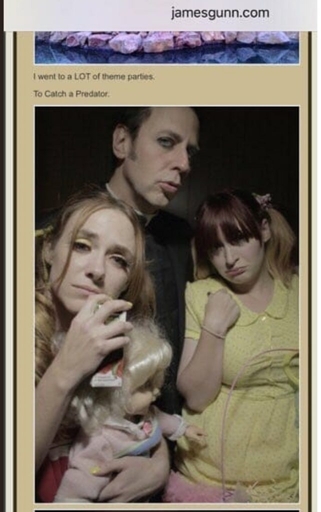 According to the screenshots of the pedophilia-themed party, which appear to come from Gunn’s personal blog, the theme of the party was “To Catch a Predator,” which is the title of a popular NBC investigative series that ran from 2004-2008. Using hidden cameras, the show would catch alleged sexual predators who had arranged to have sex with children as young as 12.
