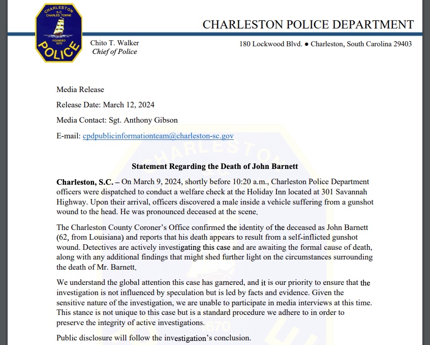 “The Charleston County Coroner’s Office confirmed the identity of the deceased as John Barnett (62, from Louisiana) and reports that his death appears to result from a self-inflicted gunshot wound,” police wrote.