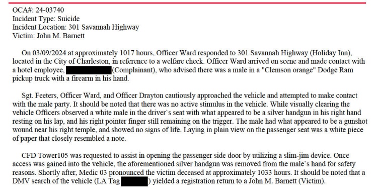 According to a Charleston Police Department incident report, a “note” was discovered near Barnett’s body “with what appeared to be a silver handgun in his right hand, resting on his lap, and his right pointer finger still remaining on the trigger.”