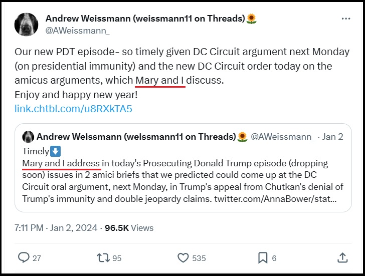 I have been sounding the alarm about Mary McCord for a long time. A few days ago, Andrew Weissmann, who together with Norm Eisen created the Lawfare arguments that Jack Smith is using {GO DEEP}, confirmed that he is working with Mary McCord.